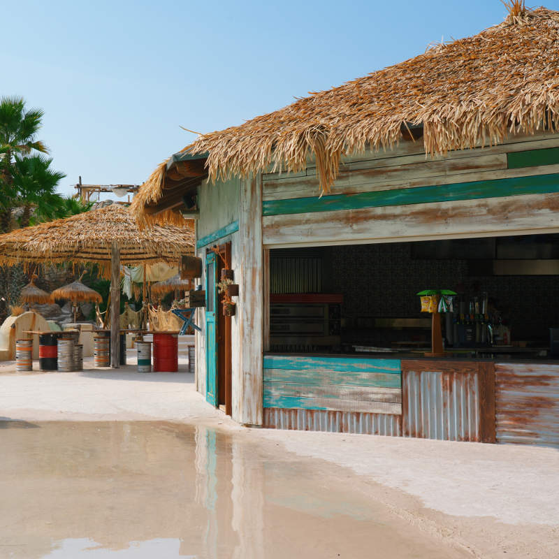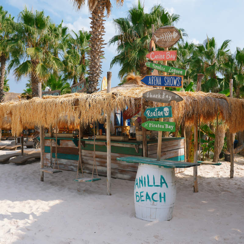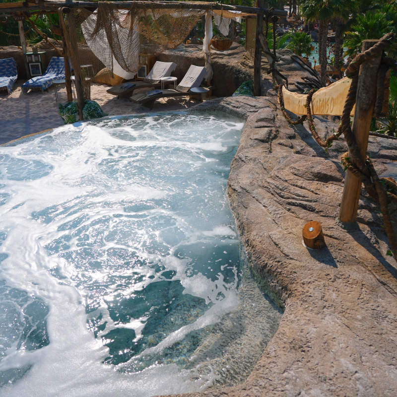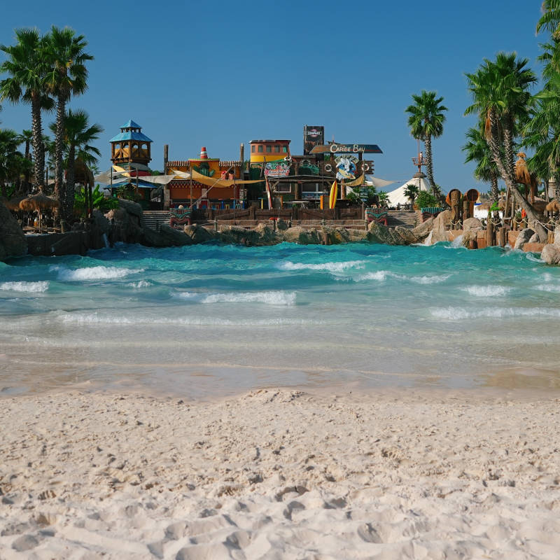 Forget the real world and dive into the Caribbean Sea: crystal clear water, coral sand, music and fun for everyone. Relax among the palm trees, on king size sun loungers under sun umbrellas made of banana leaves, and enjoy cocktails from the beach bar! You're in Shark Bay, the only swimming pool in the world with waves and sand both in and out of the water, twinned with Playa Sisal in Mexico
