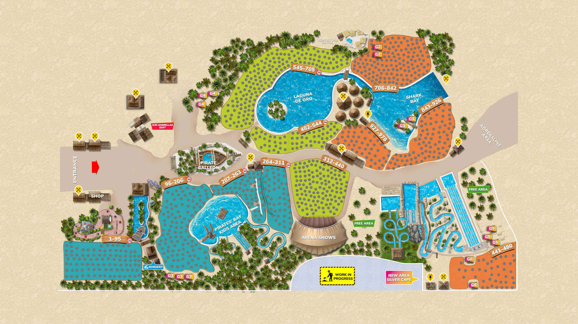 The new Silver Cove area has a scenic terrace with a refreshment point, services, and a beach bar serving Caribbean cocktails. The perfect place to relax away from the Park's busiest areas, still full of fun